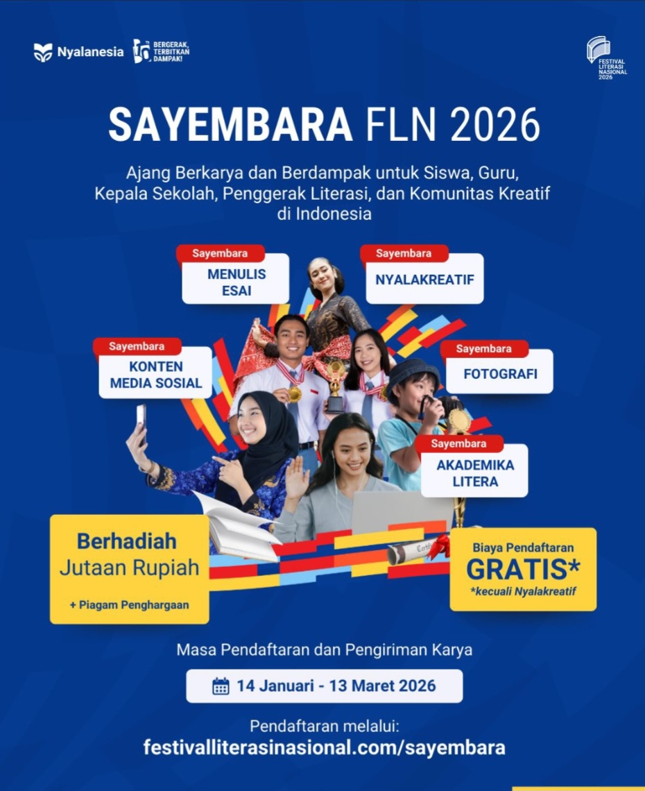 Sayembara FLN 2026 merupakan rangkaian acara pembuka dari Festival Literasi Nasional 2026. Mengusung semangat “Bergerak, Terbitkan Dampak”, sayembara ini menjadi ruang untuk berbagi karya, gagasan, praktik baik, sekaligus merayakan satu dekade perjalanan Nyalanesia.