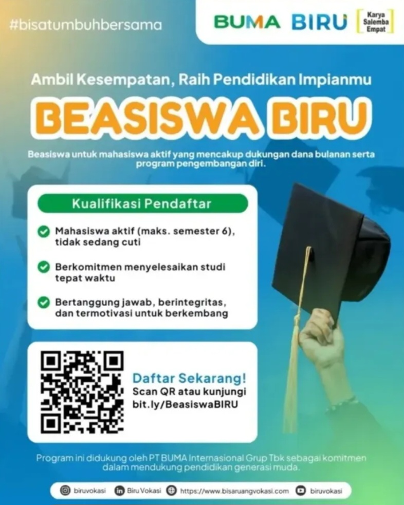Beasiswa BIRU adalah program beasiswa untuk mahasiswa aktif perguruan tinggi di Indonesia yang membutuhkan dukungan finansial sekaligus ingin mengembangkan potensi diri. Program ini tidak hanya memberikan bantuan dana pendidikan bulanan, tetapi juga pembinaan dan pengembangan soft skills agar penerima beasiswa siap menghadapi dunia profesional .