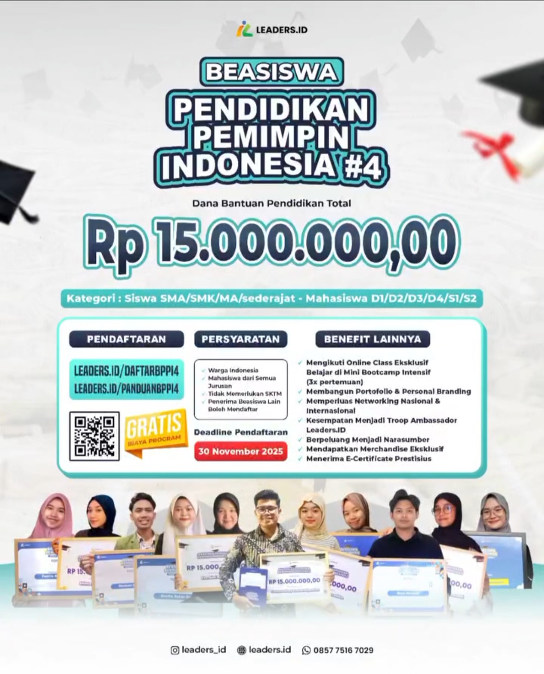 Hai calon pemimpin muda Indonesia! Punya semangat belajar tinggi, cita-cita besar, dan ingin berdampak lebih luas? Tapi bingung mulai dari mana? Tenang! Beasiswa Pendidikan Pemimpin Indonesia #4 hadir sebagai wadah pengembangan diri, karier, dan masa depan pendidikanmu! Dana Bantuan Pendidikan hingga total Rp15.000.000 Cara Daftarnya Mudah Banget!