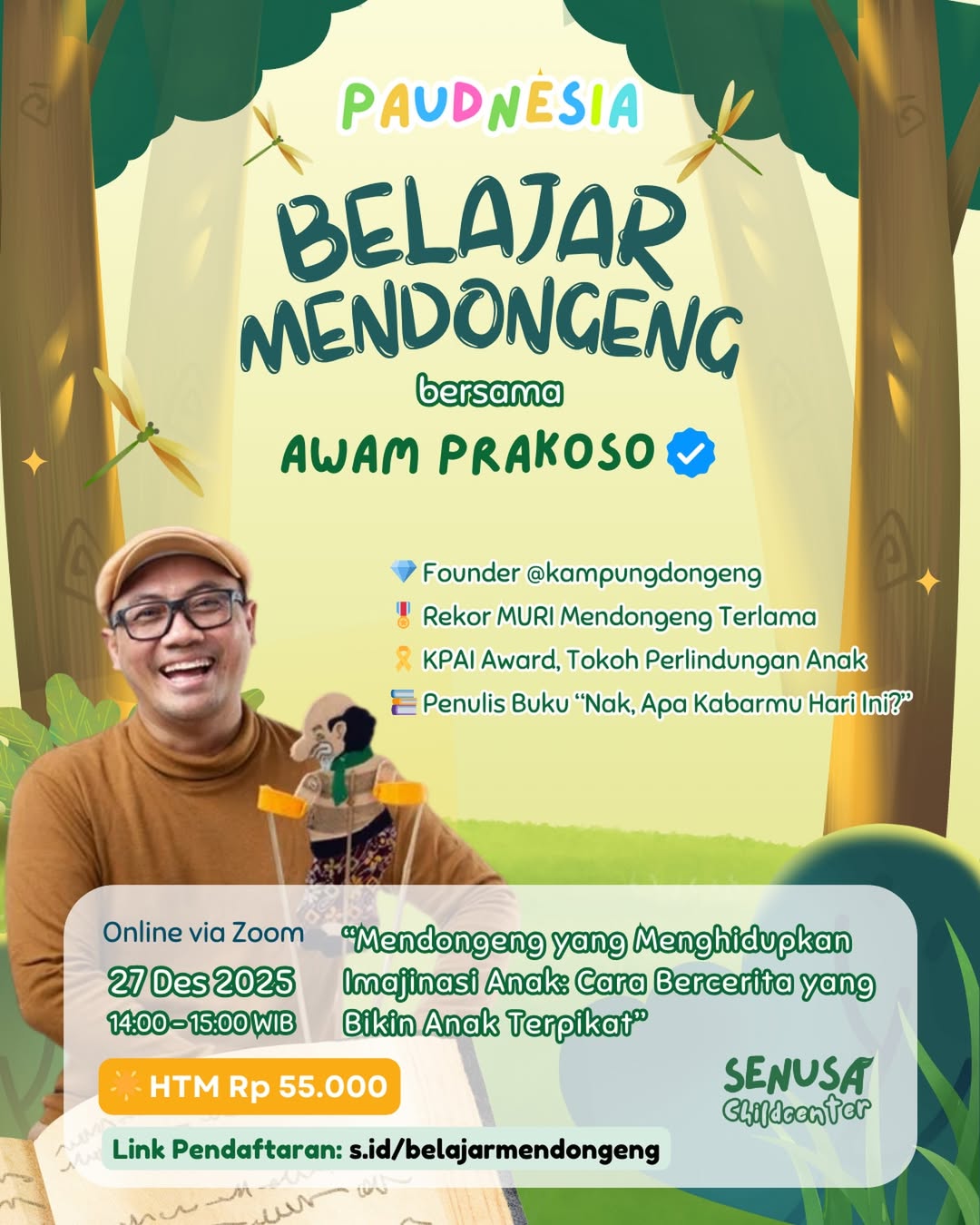 Webinar “Belajar Mendongeng yang Menghidupkan Imajinasi Anak” hadir sebagai solusinya! Di sesi ini, Anda akan belajar cara bercerita yang memikat, teknik sederhana namun ampuh untuk membuat anak terhanyut dalam alur cerita, serta trik membangun suasana dongeng yang hidup dan menyenangkan.