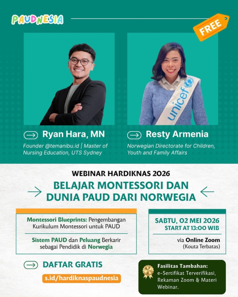 Belajar Montessori & Sistem PAUD dari Norwegia dalam rangka memperingati Hari Pendidikan Nasional Tahun 2026, Paudnesia menghadirkan webinar inspiratif untuk para pendidik & orang tua!