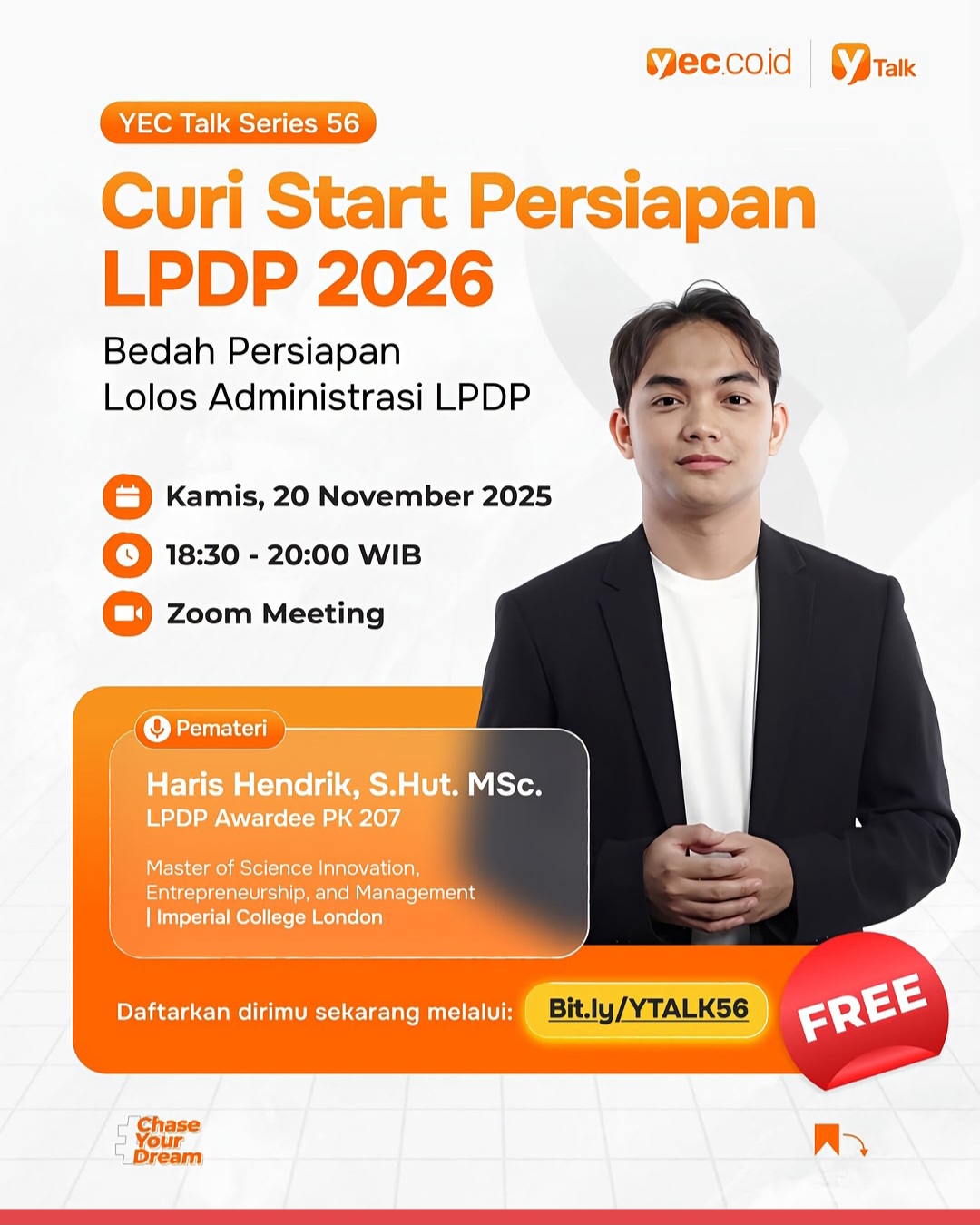 Yuk Ikuti YEC TALK 56 yang kali ini akan membahas seputar Bagaimana Mempersiapkan Diri untuk mendaftar LPDP dari jauh-jauh hari. Webinar akan dilaksankan pada
