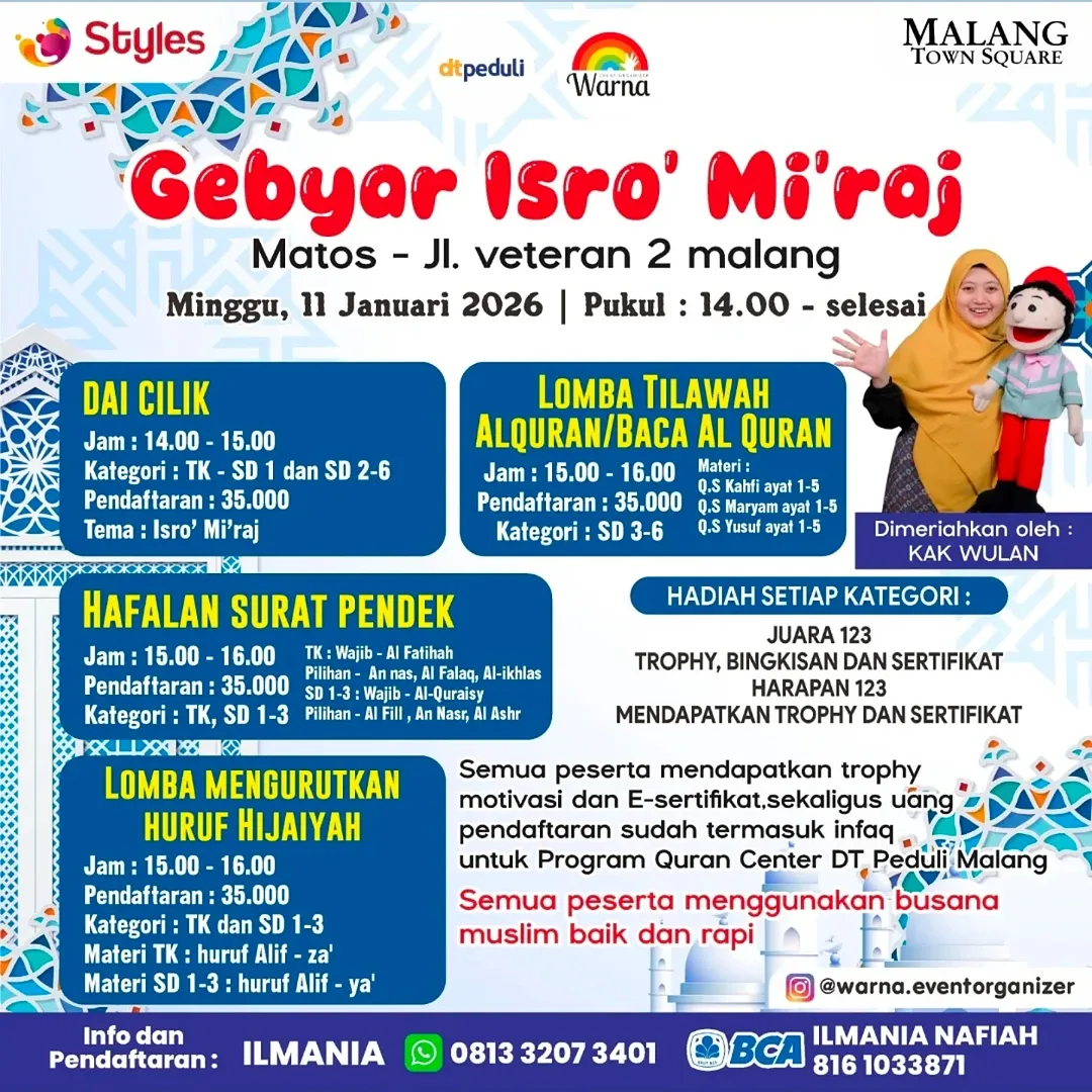 Dalam rangka memperingati Isra’ Mi’raj Nabi Muhammad SAW, Gebyar Isra’ Mi’raj akan digelar pada Minggu, 11 Januari 2026, mulai pukul 14.00 WIB di Malang Town Square (MATOS), Jalan Veteran 2, Kota Malang.