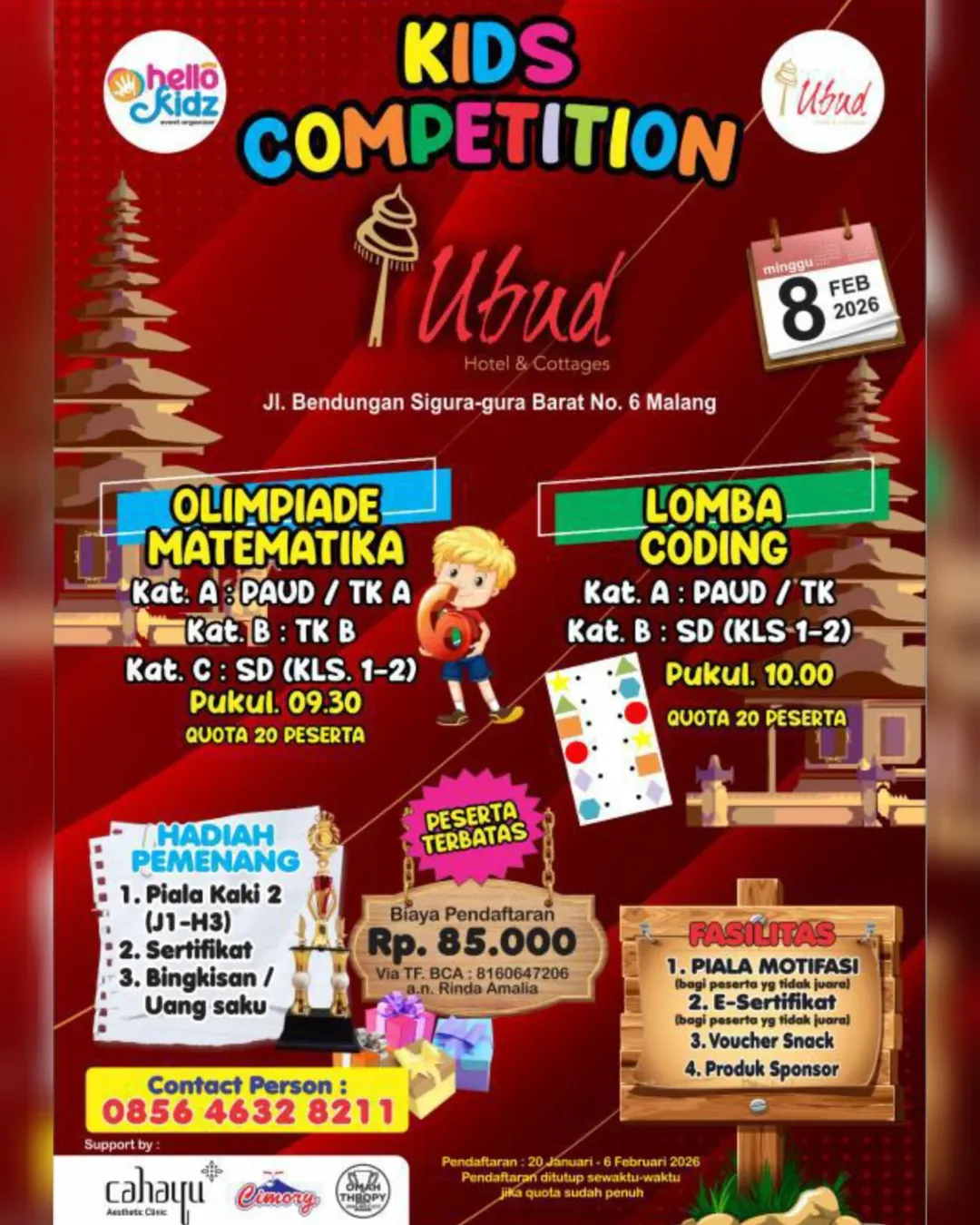 Malang — Hello Kidz bekerja sama dengan Ubud Hotel & Cottages kembali menggelar Kids Competition yang akan berlangsung pada Minggu, 8 Februari 2026, bertempat di Ubud Hotel & Cottages, Jl. Bendungan Sigura-gura Barat No. 6, Malang.