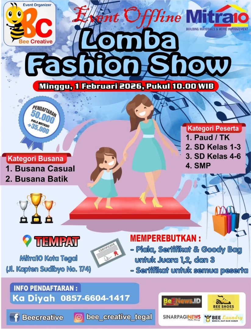 Tegal — Bee Creative Event Organizer akan menggelar Lomba Fashion Show secara offline pada Minggu, 1 Februari 2026, pukul 10.00 WIB, bertempat di Mitra10 Kota Tegal, Jl. Kapten Sudibyo No. 174.