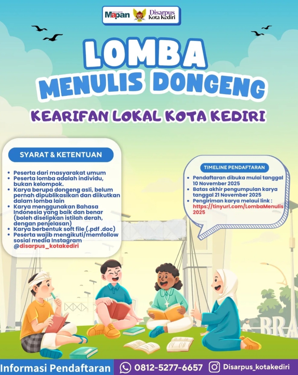 Lomba Menulis Dongeng: Kearifan Lokal Kota Kediri 2025 Hallo Sobat Disarpus Yuk ikuti lomba menulis dongeng, simak tata cara nya ya (Divkominfoapgpaud- shfr 18/11/2025)