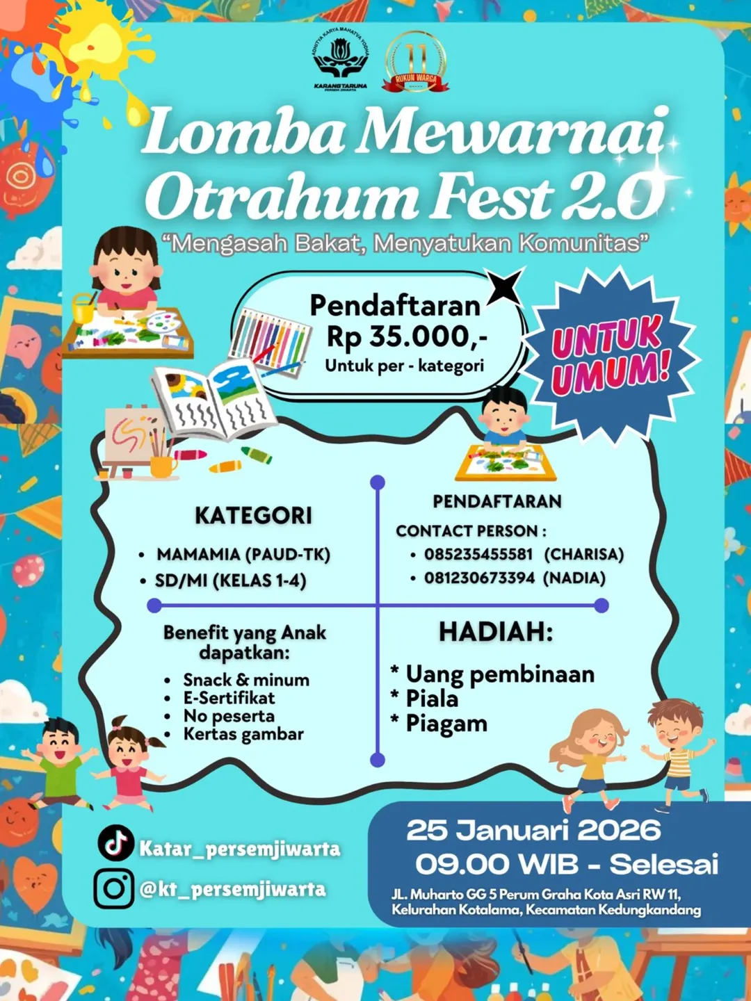 Mari ikuti event kreatif untuk anak yang sangat edukatif dan menarik. Untuk pertanyaan, pendaftaran, dan detail teknis mengenai acara ini, mohon untuk menghubungi kontak penyelenggara (EO) yang tertera pada poster/informasi di atas atau menghubungi langsung ke narahubung. (NEP)