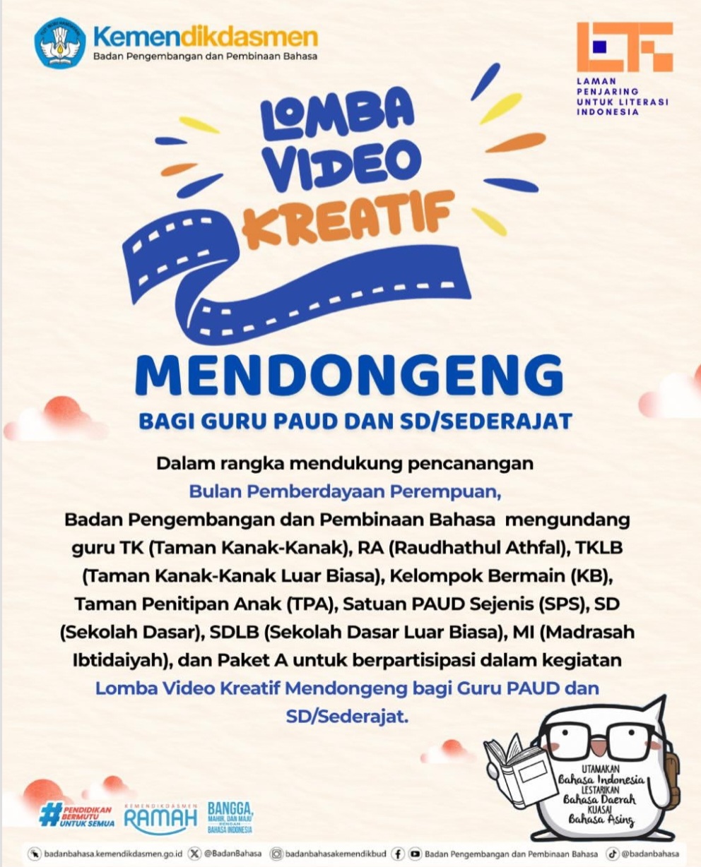 Dalam rangka mendukung pencanangan Bulan Pemberdayaan Perempuan, Badan Pengembangan dan Pembinaan Bahasa melalui Pusat Pemberdayaan Bahasa dan Sastra akan melaksanakan Kegiatan Lentera (Laman Penjaring untuk Literasi Indonesia) yang berupa Lomba Video Kreatif Mendongeng bagi Guru PAUD dan SD/Sederajat. Oleh karena itu, Pusat Pemberdayaan Bahasa dan Sastra mengundang guru PAUD dan SD/sederajat di seluruh Indonesia untuk berpartisipasi dalam kegiatan ini.