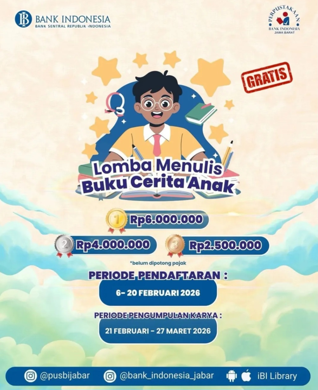 Dalam rangkaian event World Book Day (WBD) 2026, Perpustakaan Bank Indonesia Jawa Barat mengadakan “Lomba Menulis Cerita Anak” untuk kamu yang hobi menulis✍️