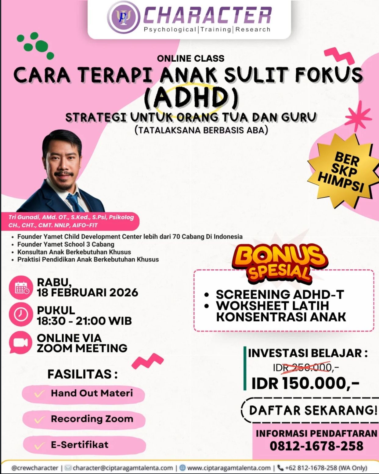Melalui Online Class: Dampingi Anak Sulit Fokus (ADHD), Anda akan mempelajari strategi praktis berbasis ABA yang bisa langsung diterapkan di rumah, sekolah, maupun ruang terapi.