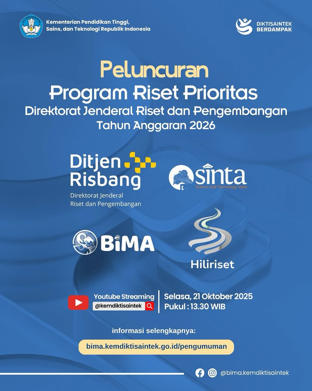Dalam rangka implementasi Program Riset Prioritas Tahun Anggaran 2026, Direktorat Jenderal Riset dan Pengembangan akan meluncurkan Program Riset Prioritas Tahun Anggaran 2026. Langkah ini menandai komitmen untuk membangun ekosistem riset yang berdampak dan berkelanjutan. Dengan kolaborasi lintas perguruan tinggi, peneliti, dan dunia usaha, riset Indonesia bergerak menuju masa depan yang mandiri dalam ilmu pengetahuan, unggul dalam inovasi, dan tangguh menghadapi tantangan global. (NEP)