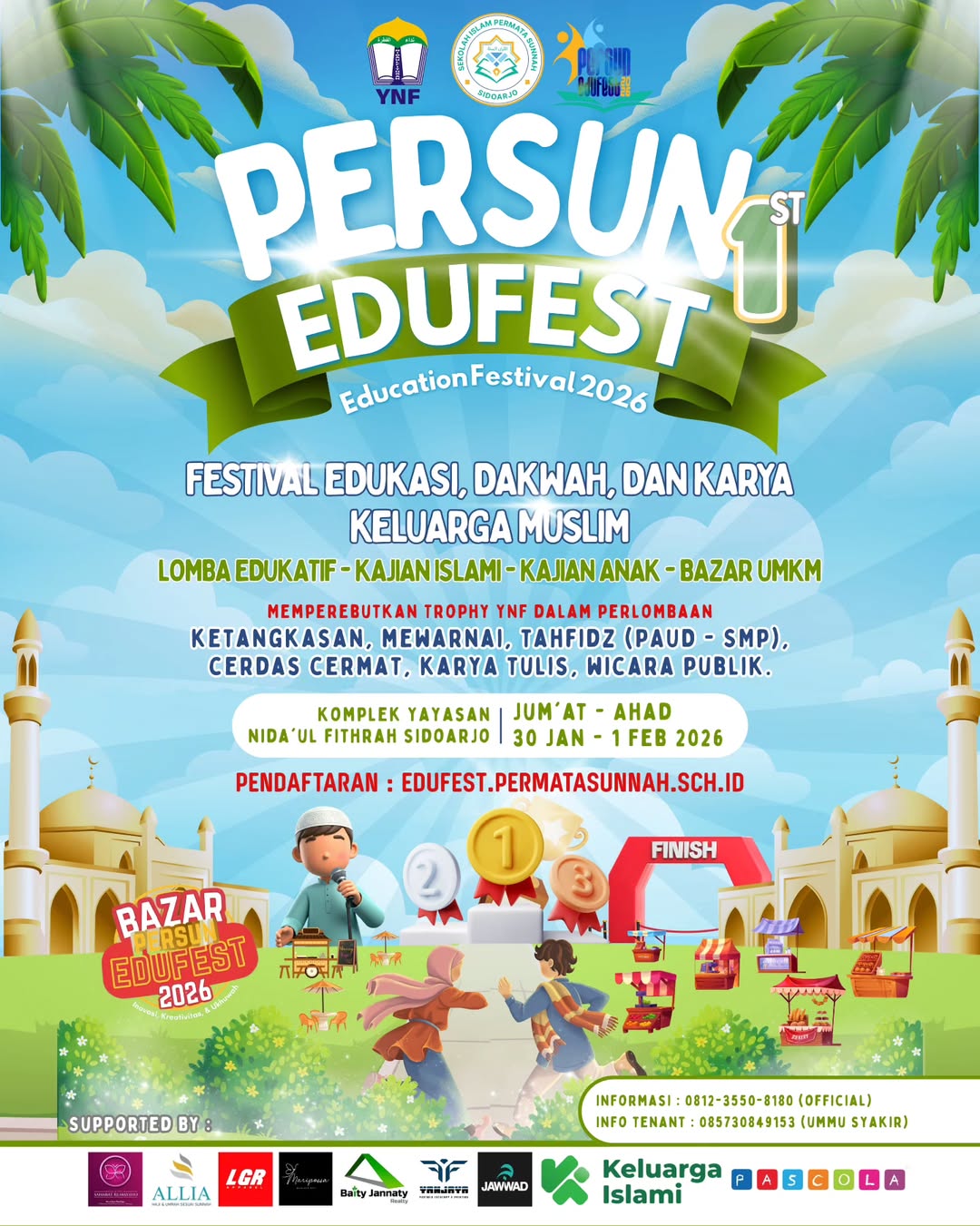 Sidoarjo — PERSUN EDUFEST 1 (Permata Sunnah Education Festival 2026) akan digelar pada Jumat–Ahad, 30 Januari–1 Februari 2026, bertempat di Komplek Yayasan Nida’ul Fithrah, Sidoarjo. Kegiatan ini merupakan festival edukasi, dakwah, dan karya yang ditujukan bagi keluarga muslim.