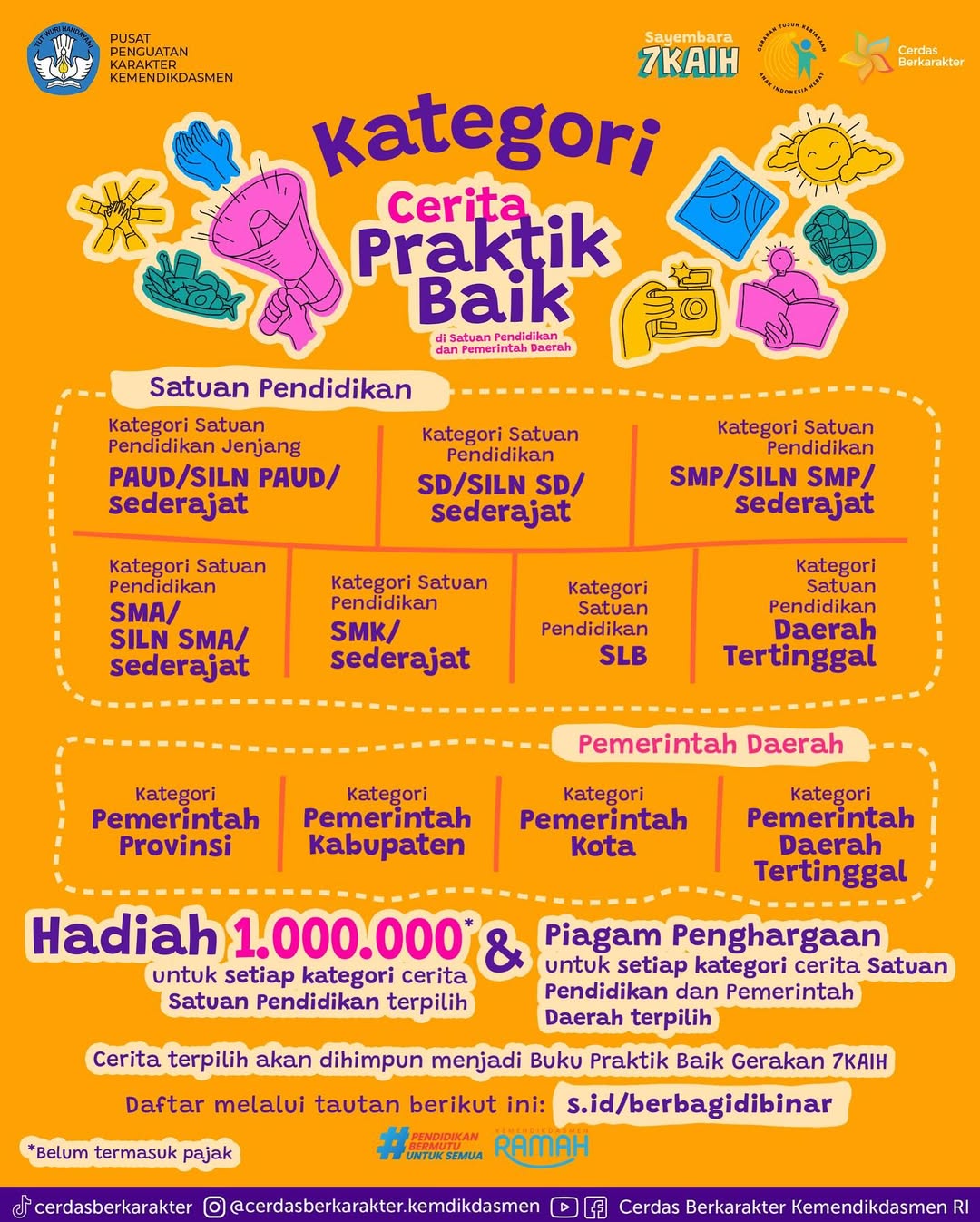 Saatnya berbagi cerita inspiratif dari sekolah dan daerahmu. Kegiatan ini diselenggarakan oleh Pusat Penguatan Karakter Kemendikdasmen dengan berbagai kategori untuk satuan pendidikan dan pemerintah daerah. Jadi bagian dari dokumentasi nasional sebagai inspirasi bersama dan menangkan hadiah Rp1.000.000 untuk setiap kategori terpilih serta piagam penghargaan. Sayembara ini gratis, lo! Yuk, daftarkan cerita terbaikmu sekarang melalui tautan berikut: http://s.id/berbagidibinar (NEP)