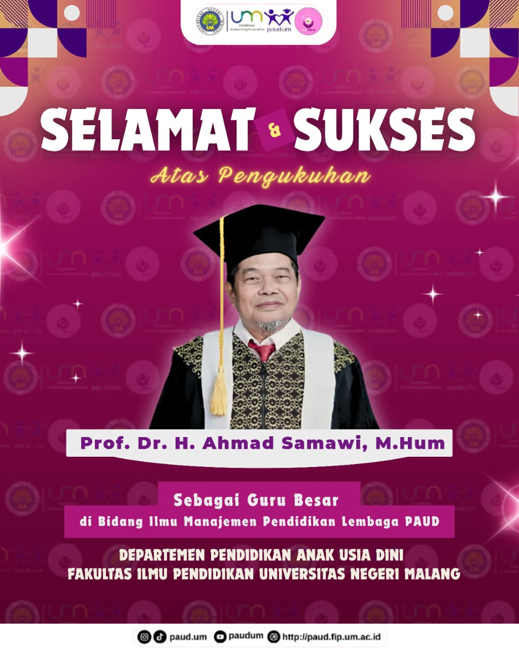 Pengukuhan guru besar ini juga menjadi bentuk apresiasi atas dedikasi, kontribusi ilmiah, dan kiprah Prof. Ahmad Samawi dalam pengembangan pendidikan anak usia dini, baik melalui kegiatan akademik, penelitian, maupun pengabdian kepada masyarakat. Keahlian beliau di bidang manajemen pendidikan PAUD diharapkan dapat memperkuat posisi Universitas Negeri Malang sebagai pusat pengembangan keilmuan dan praktik pendidikan anak usia dini yang unggul.