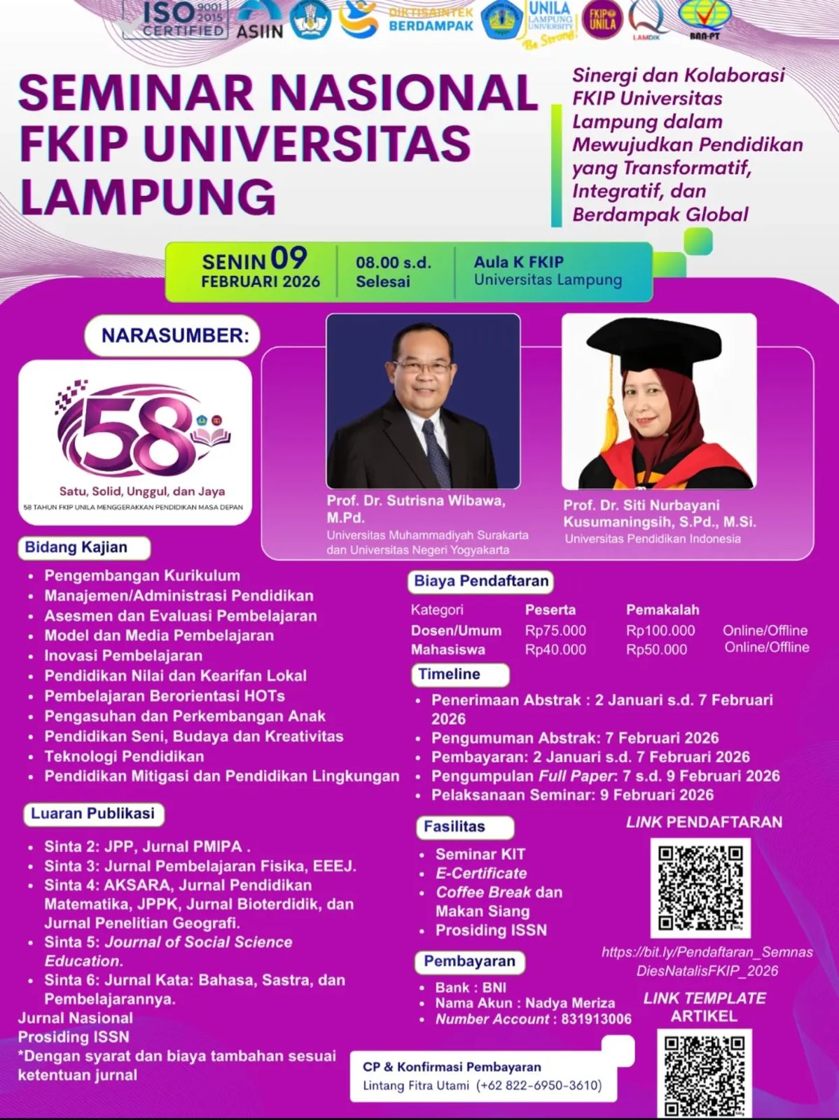 Dalam rangka *Dies Natalis FKIP Ke-58* Universitas Lampung Kami mengundang Bapak/Ibu Dosen, Guru, Peneliti, serta Mahasiswa dari seluruh Indonesia untuk berpartisipasi dalam Seminar Nasional dengan tema *Sinergi dan Kolaborasi FKIP Universitas Lampung dalam Mewujudkan Pendidikan yang Transformatif, Integratif, dan Berdampak Global*