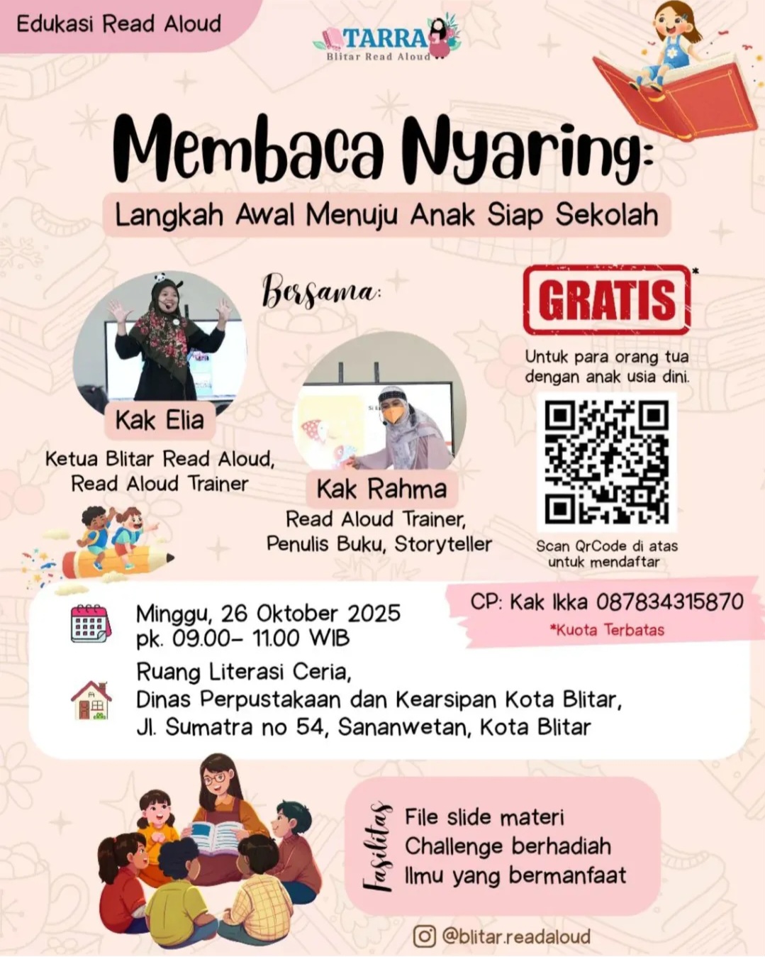 Yuk ikuti kegiatan Edukasi Read Aloud perdana TARRA, “Membaca Nyaring: Langkah Awal Menuju Anak Siap Sekolah” yang akan diselenggarakan di Ruang Literasi Ceria @dinperpusipkotablitar pada tanggal 26 Oktober 2025.
