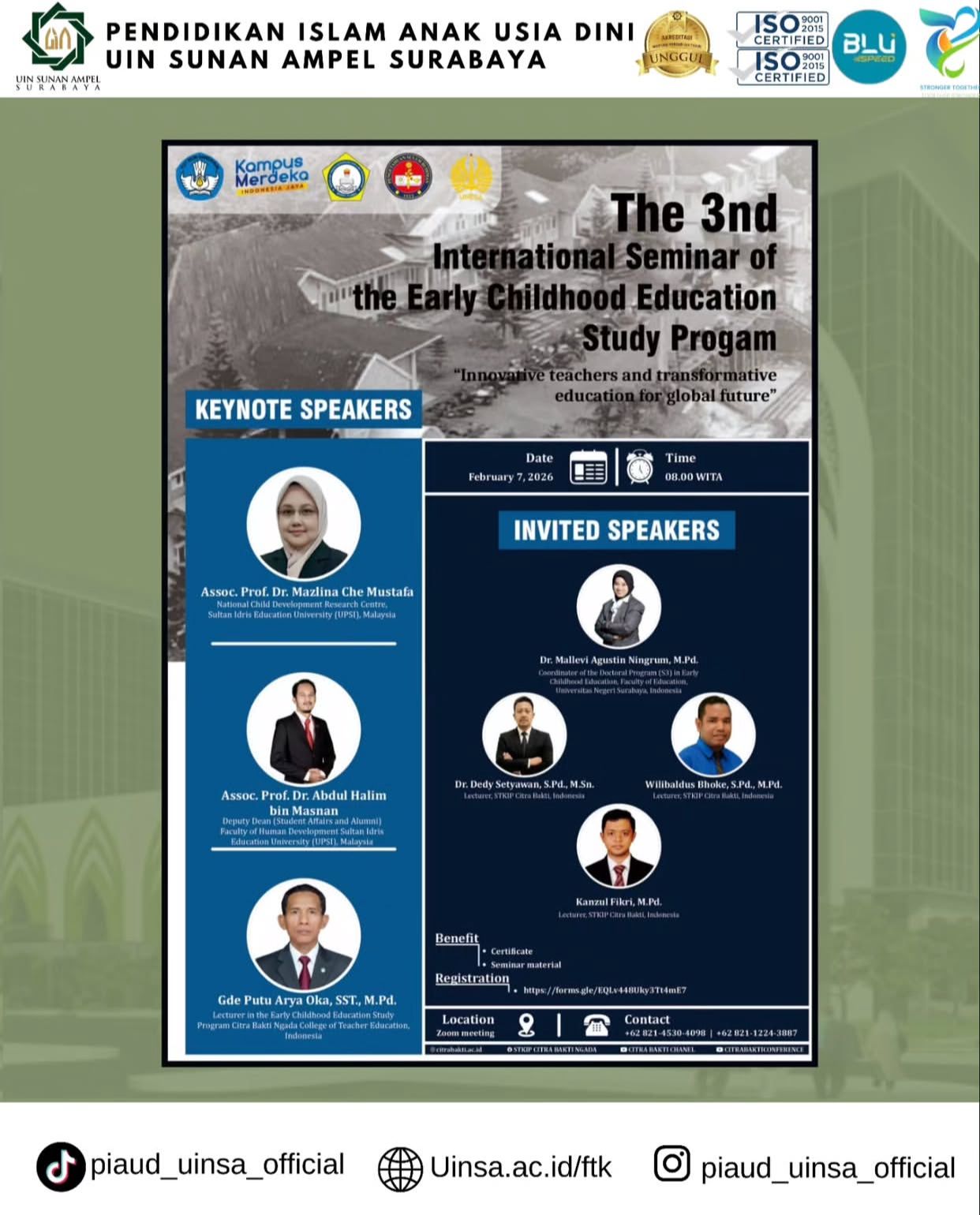 Seminar ini menghadirkan keynote speakers dan invited speakers dari Indonesia dan Malaysia yang berkompeten yang akan membahas inovasi pembelajaran dan pendidikan transformatif bagi masa depan global Khusus nya pada Pendidikan anak usia dini