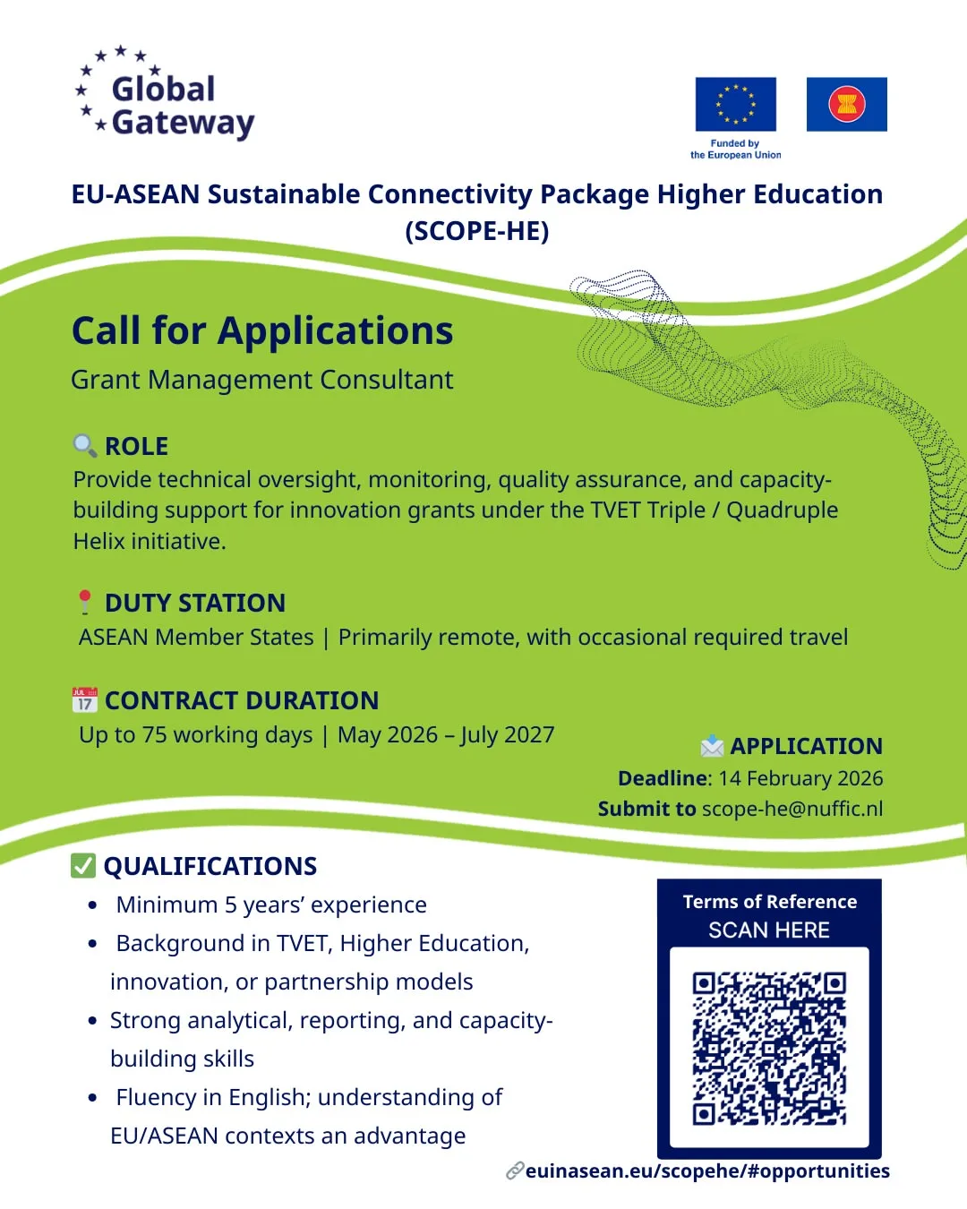 The EU–ASEAN Sustainable Connectivity Package – Higher Education (SCOPE-HE) is inviting applications for a Grant Management Consultant to provide technical, managerial, and strategic support for the implementation, monitoring, and reporting of TVET Triple/Quadruple Helix Models (TQHM) grants, ensuring alignment with SCOPE-HE objectives, quality standards, requirements, and expected results.