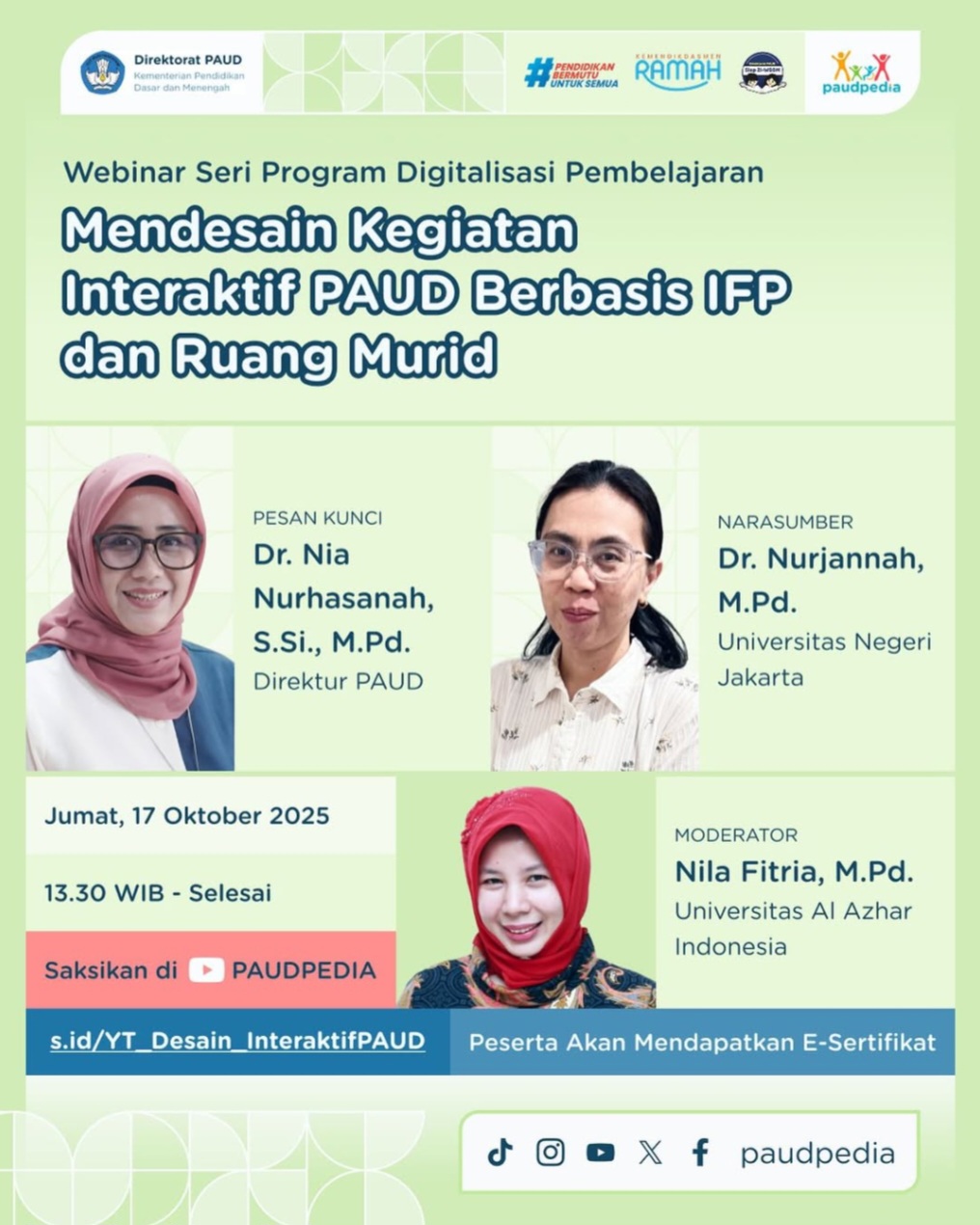 Merujuk perihal di atas, Direktorat PAUD akan menyelenggarakan Webinar Seri Program Digitalisasi Pembelajaran “Mendesain Kegiatan Interaktif PAUD Berbasis IFP dan Ruang Muri” pada: