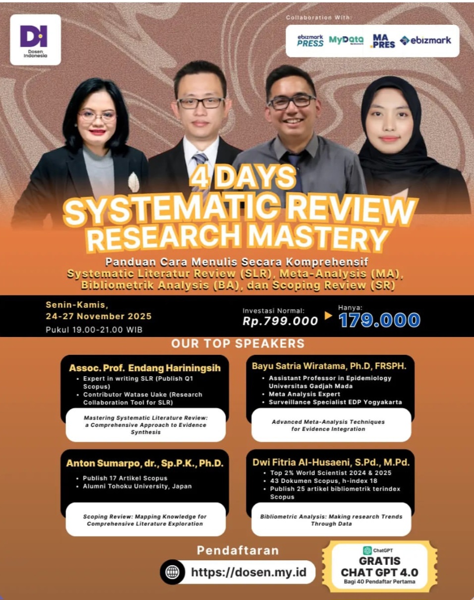 Pelajari langkah demi langkah penulisan Systematic Literature Review (SLR), Meta-Analysis (MA), Bibliometric Analysis (BA), dan Scoping Review (SR) secara sistematis, relevan, dan siap publikasi Scopus bersama 4 narasumber terbaik di bidangnya!