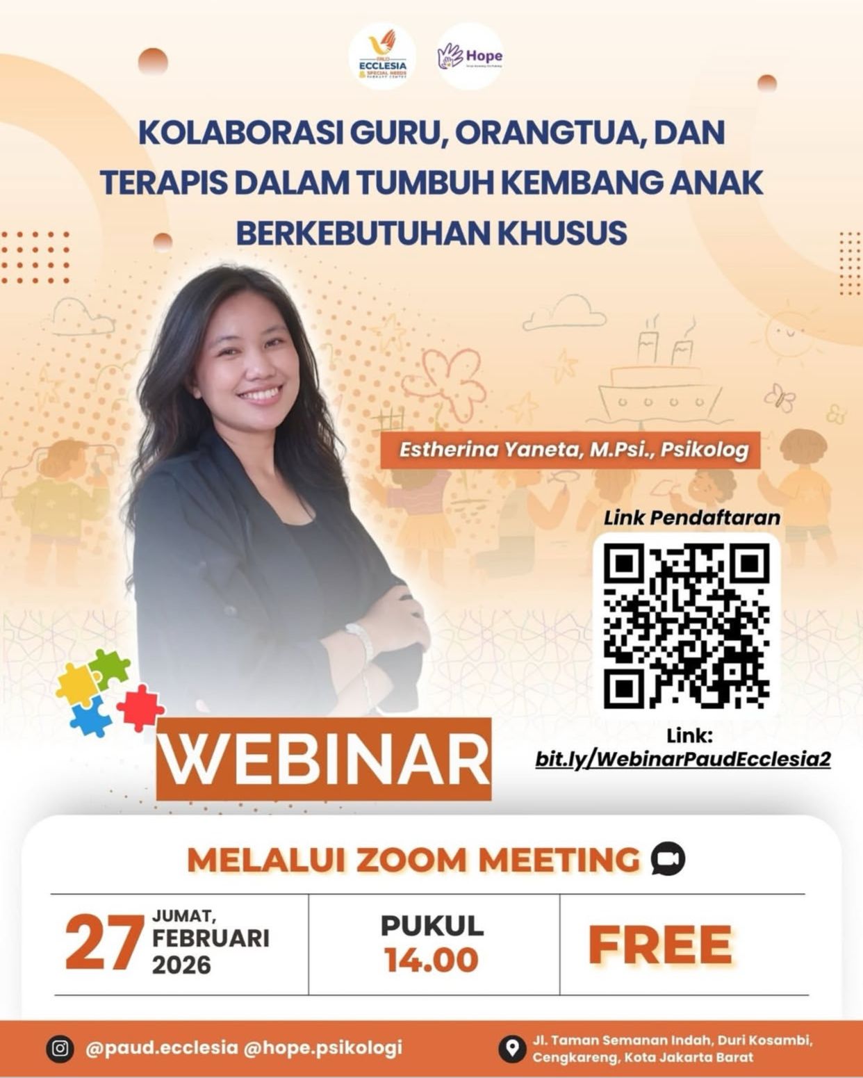 Mari ikuti webinar GRATIS yang ditujukan untuk Orangtua, Guru dan Terapis yang mendidik dan mengasuh Anak Berkebutuhan Khusus agar kita bisa bekerja sama untuk pertumbuhan dan perkembangan anak-anak kita semua.