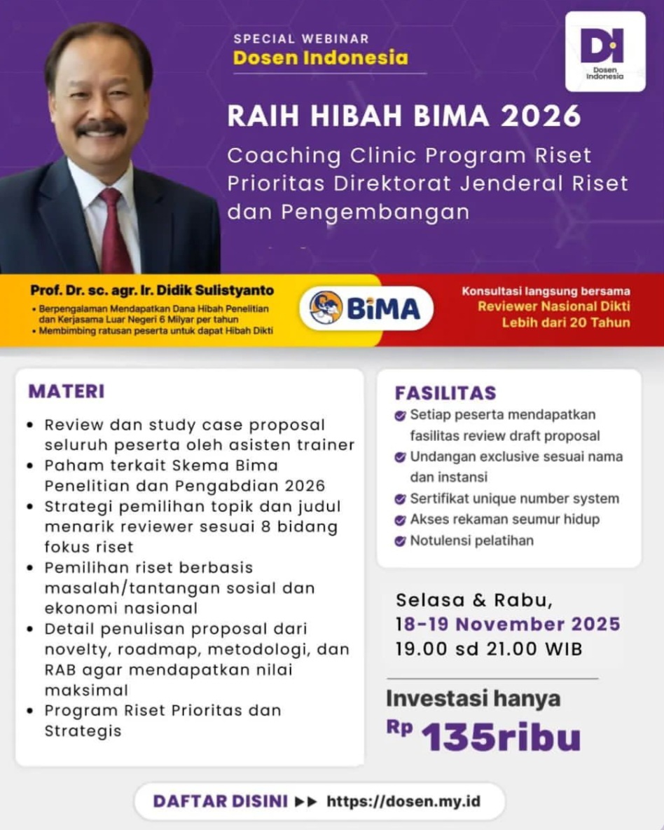 Bersiaplah menembus pendanaan riset nasional dengan strategi yang terarah dan teruji langsung dari Reviewer Nasional Dikti berpengalaman lebih dari 20 tahun!