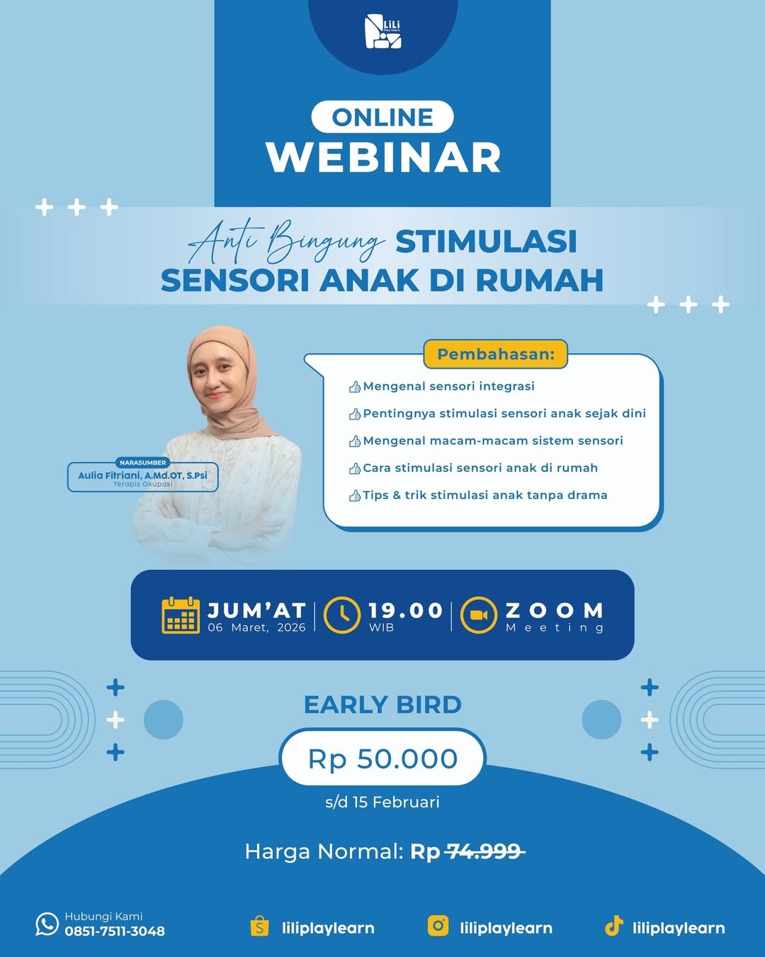 Yuk, ikut webinar “Anti Bingung Stimulasi Sensori Anak di Rumah”, bareng Miss Aulia, A.Md.OT, S.Psi. dan parents lainnya. Kegiatan webinar akan dilaksanak pada Jumat, 6 Maret 2026 pukul 19.00 WIB melalui ruang virtual zoom meeting. Untuk informasi lebih lanjut silahkan menghubungi kontak yang tertera pada flyer.