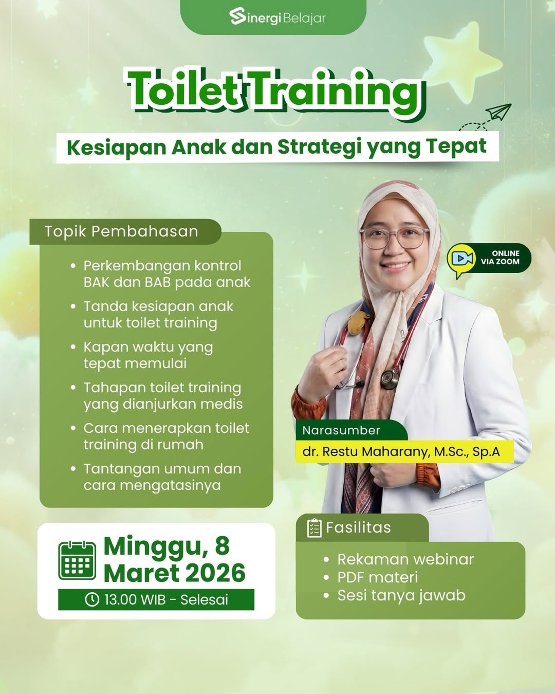 SinergiBelajar menggelar webinar bertema “Toilet Training: Kesiapan Anak dan Strategi yang Tepat” pada Minggu, 8 Maret 2026 pukul 13.00 WIB hingga selesai secara online via Zoom. Kegiatan ini menghadirkan narasumber dr. Restu Maharany, M.Sc., Sp.A yang akan membahas perkembangan kontrol BAK dan BAB pada anak, tanda kesiapan toilet training, waktu yang tepat memulai, tahapan yang dianjurkan secara medis, hingga cara penerapan di rumah beserta solusi atas tantangan umum.