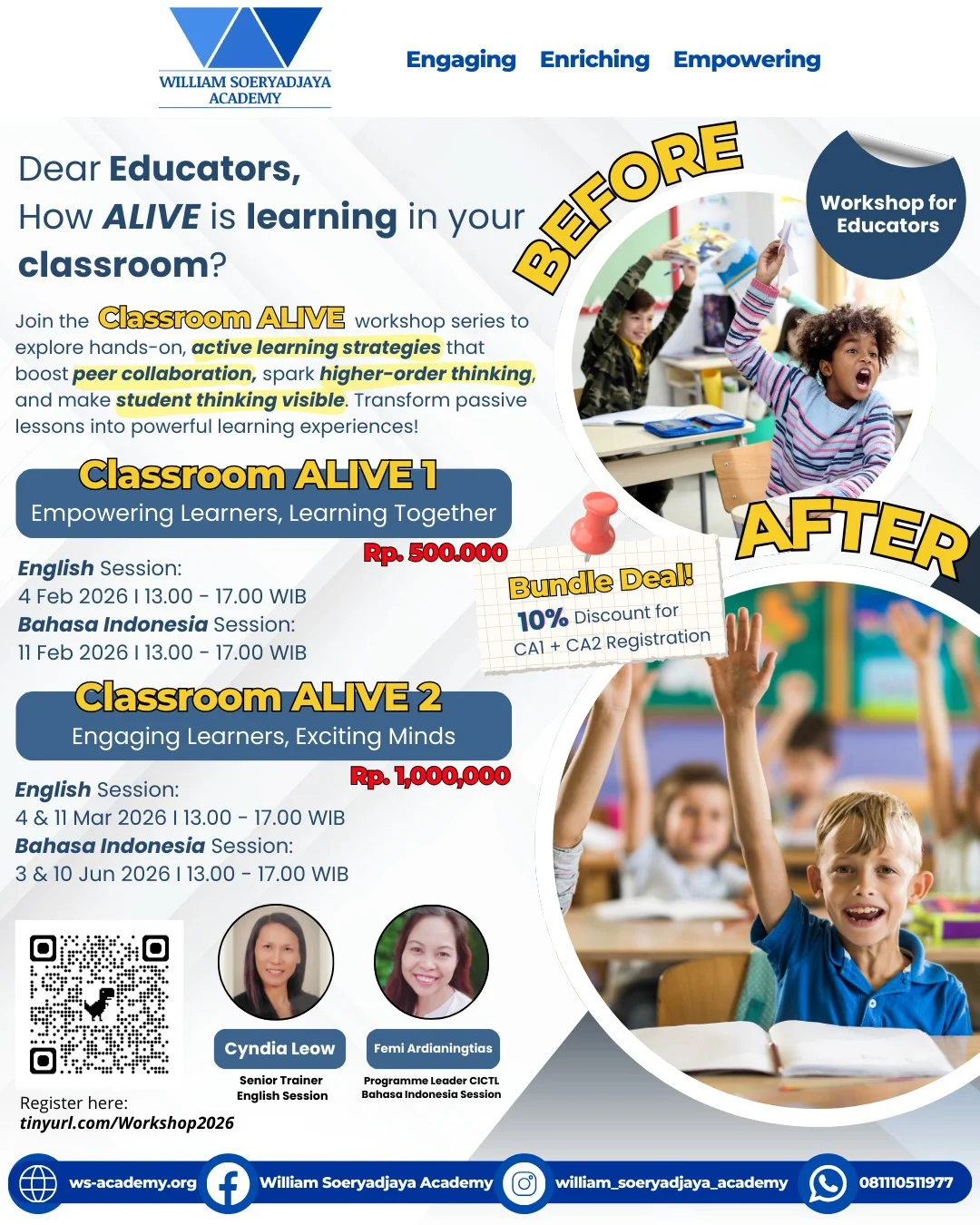 Rangkaian workshop terdiri dari dua level, yaitu Classroom ALIVE 1: Empowering Learners, Learning Together dan Classroom ALIVE 2: Engaging Learners, Exciting Minds. Sesi tersedia dalam Bahasa Inggris dan Bahasa Indonesia, dengan jadwal sepanjang Februari hingga Juni 2026. Workshop akan dipandu oleh Cyndia Leow (Senior Trainer – English Session) dan Femi Ardianningtias (Programme Leader CICTL – Bahasa Indonesia Session).